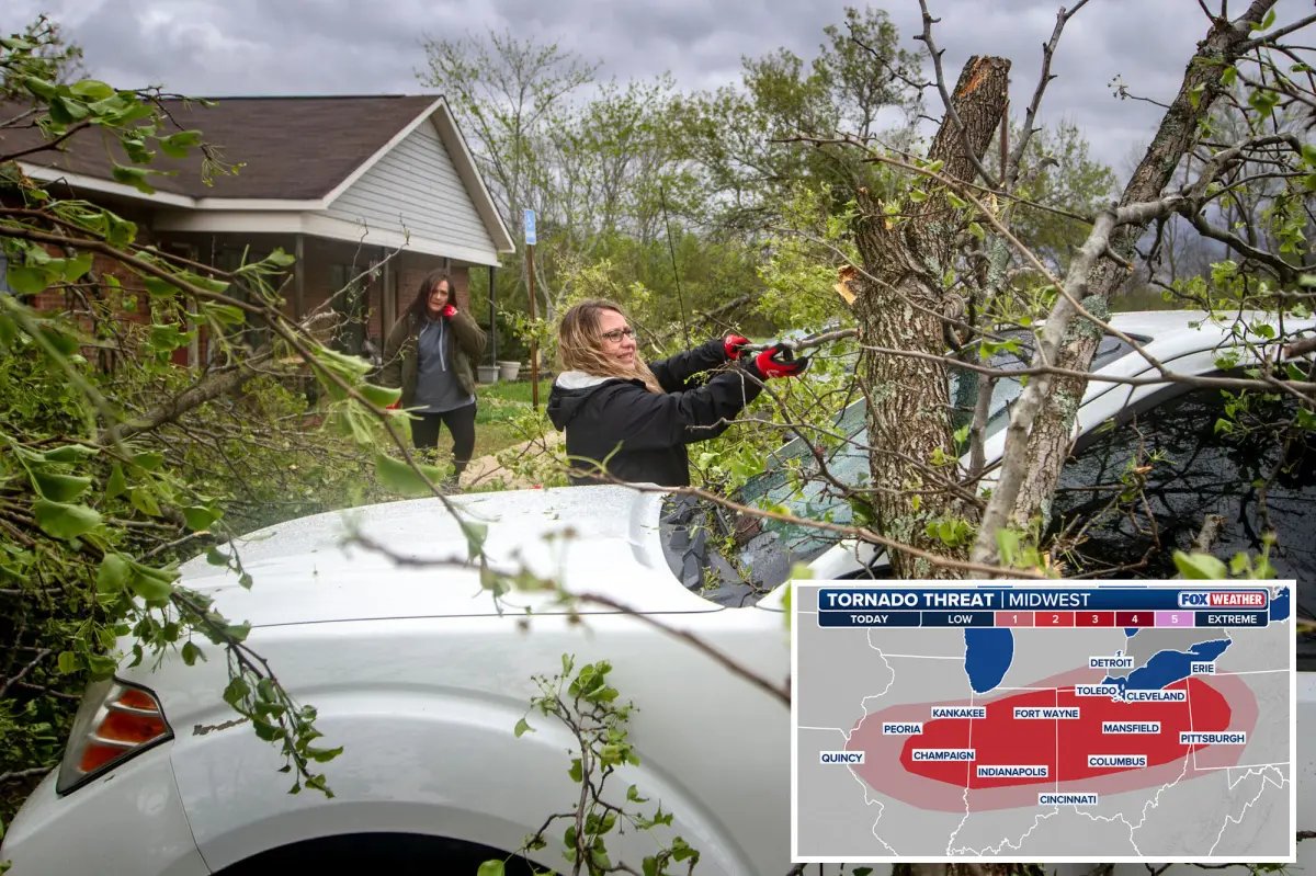 The areas most at risk of a strong tornado span a corridor from Peoria, Illinois, eastward through Indianapolis and much of Ohio to Pittsburgh.