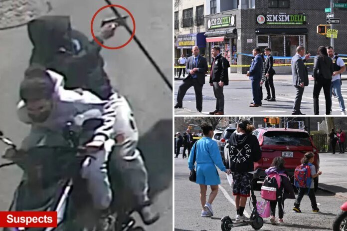 The family was strolling near Humboldt and Moore streets early in the afternoon when the shots rang out, and the two suspected gunmen sped off, the sources said. Obtained by NY Post