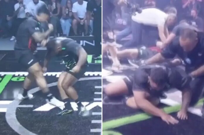 In the video, two heavyweights run towards each other and one of them came off worse for wear in a brutal collision, falling to the ground in a whiplash motion, while the other fighter appeared dazed too.