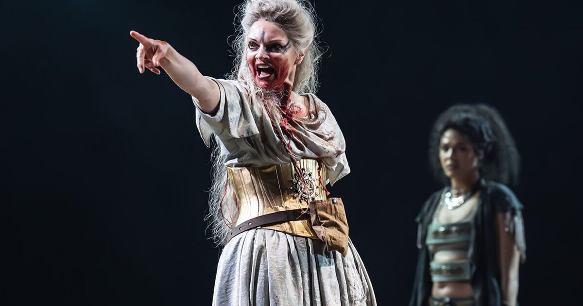 Following a spectacular opening with a huge horse whose flowing surcoat is dripping with blood galloping towards us out of a ring of light, the tone changes abruptly to a mundane metaplay with lots of effing and blinding and shouting and gorblimey accents (“We just topple dickhead dictators!”) intended to expose theatrical trappings and challenge the audience. Imagine a feral female equivalent of Shakespeare’s Rude Mechanicals giving it large to the respectful patrons of the National Theatre and you’ll get the idea.