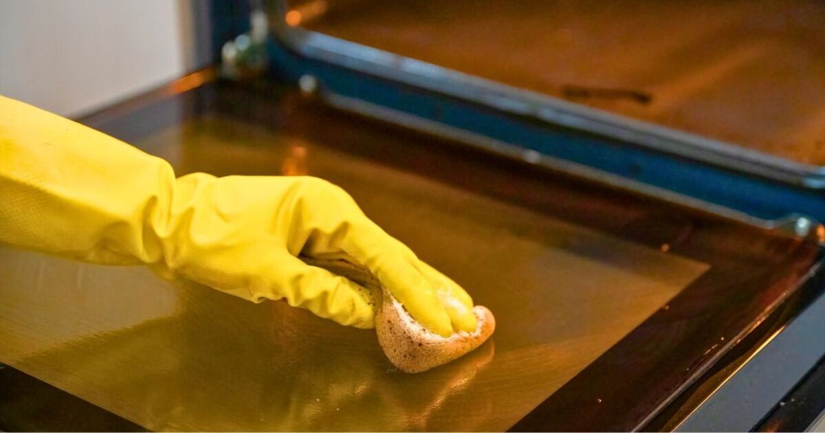 All you need to do is spread a generous amount of baking soda on the oven door, and then use a wet cloth to dampen it.