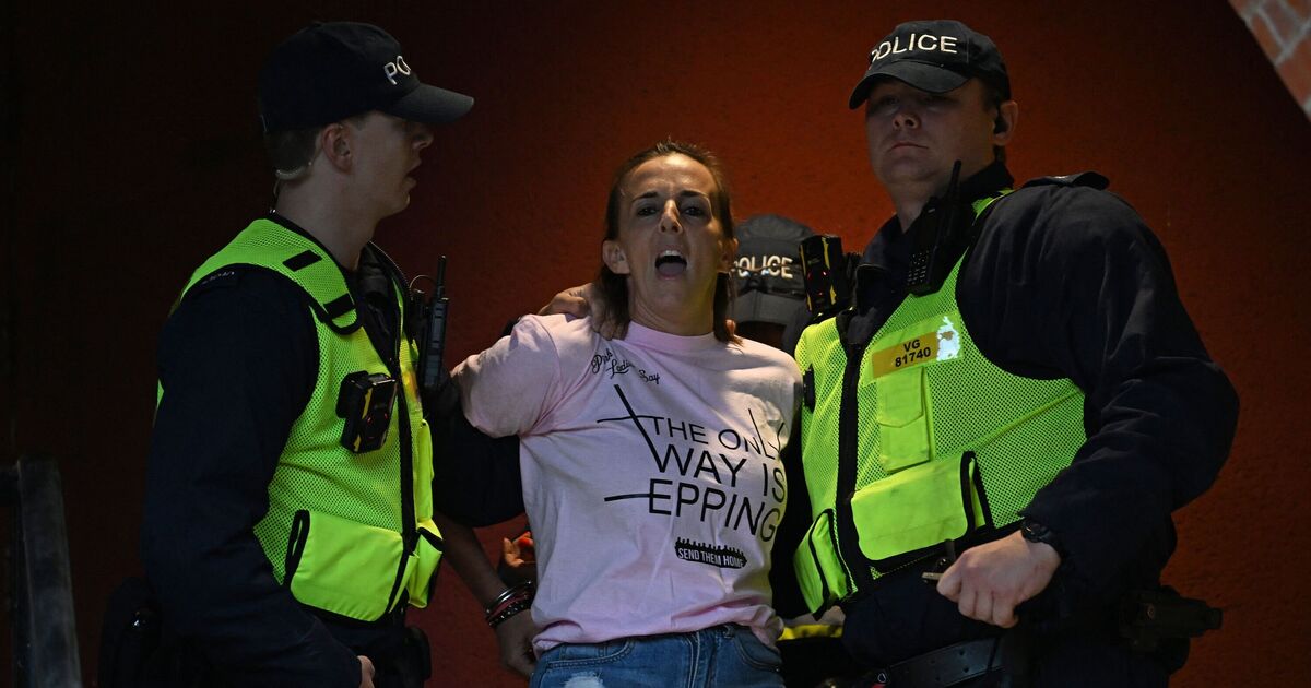 A staunch Epping protester who unfurled a Union flag from a council building during a migrant hotel demonstration has had her charges dropped. Sarah White, 40, climbed the steps at the Epping Forest District Council building after marching from the Bell Hotel, where she had given a speech on August 31. Wearing a T-shirt with “The only way is Epping” written on it, she was followed up the steps by police before being taken away.