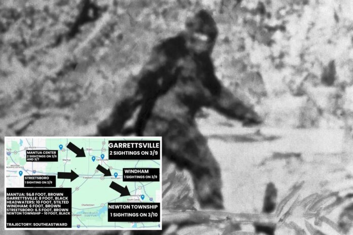 The first sighting came Friday when somebody claimed to see a 9-foot-tall beast in broad daylight before it ran off after being spotted, then Saturday an 8-foot creature was grunting in a wooded area around 11 p.m. — with a footprint reportedly being found.