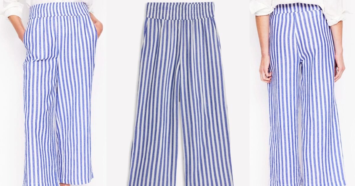 The cropped trousers feature an elongating vertical blue-and-white striped pattern and are crafted from breathable 100% cotton fabric that’s ideal for warmer weather.