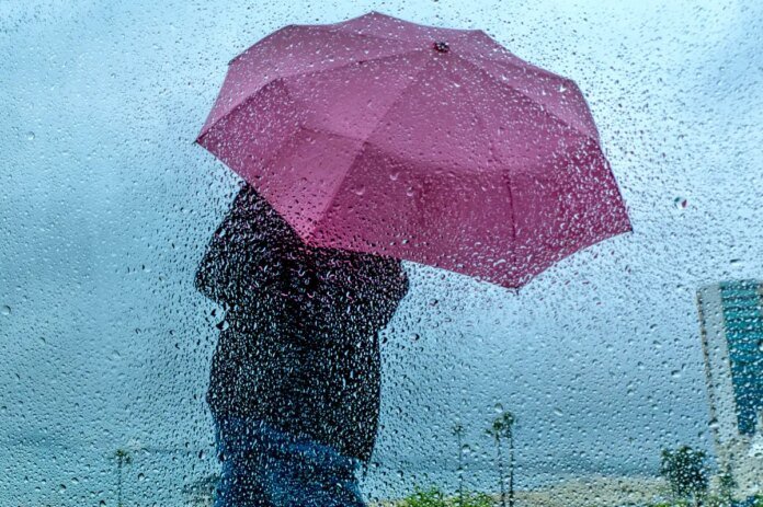 A pedestrian is viewed through raindrops on a window while walking along the coast in the rain with a view of the ocean in Long Beach, California, on Jan. 2, 2026. Los Angeles Times via Getty Images
