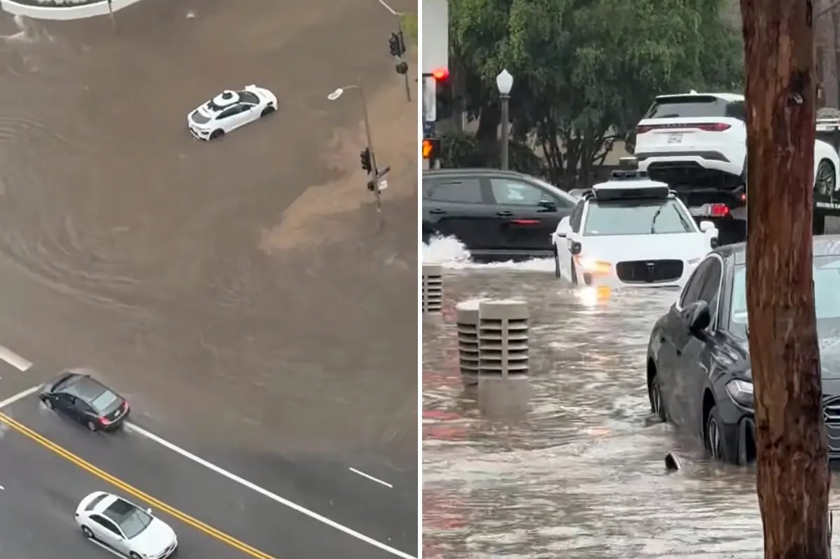 Flooded Waymo robotaxis stranded in LA storms caught on video