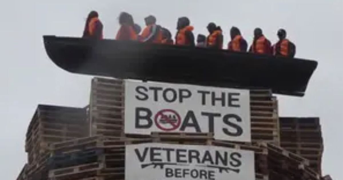 A village in Northern Ireland has sparked outrage with its “sickening racist” bonfire display featuring an effigy of migrants on a boat. Over a dozen life-sized mannequins mannequins wearing life jackets sit on top of the bonfire in Moygashel, on the outskirts of Dungannon in County Tyrone. There are also several signs below the boat, one stating “stop the boats” and another sying “veterans before refugees”.