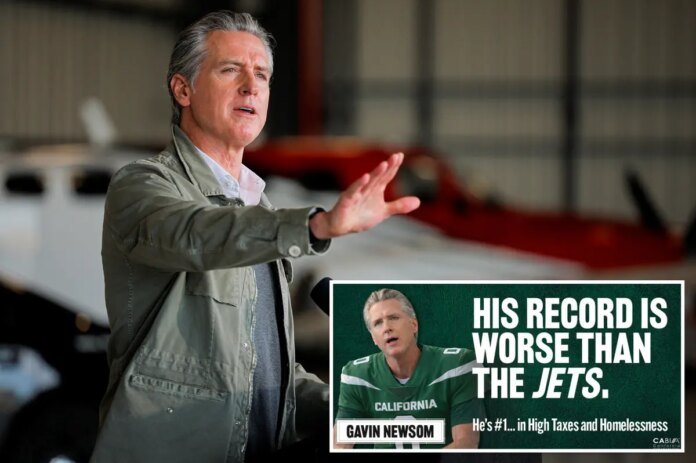 Gavin Newsom took a hit 3,000 miles away after a billboard was unveiled in New York City’s iconic Times Square comparing the California governor to the NFL’s hapless New York Jets.