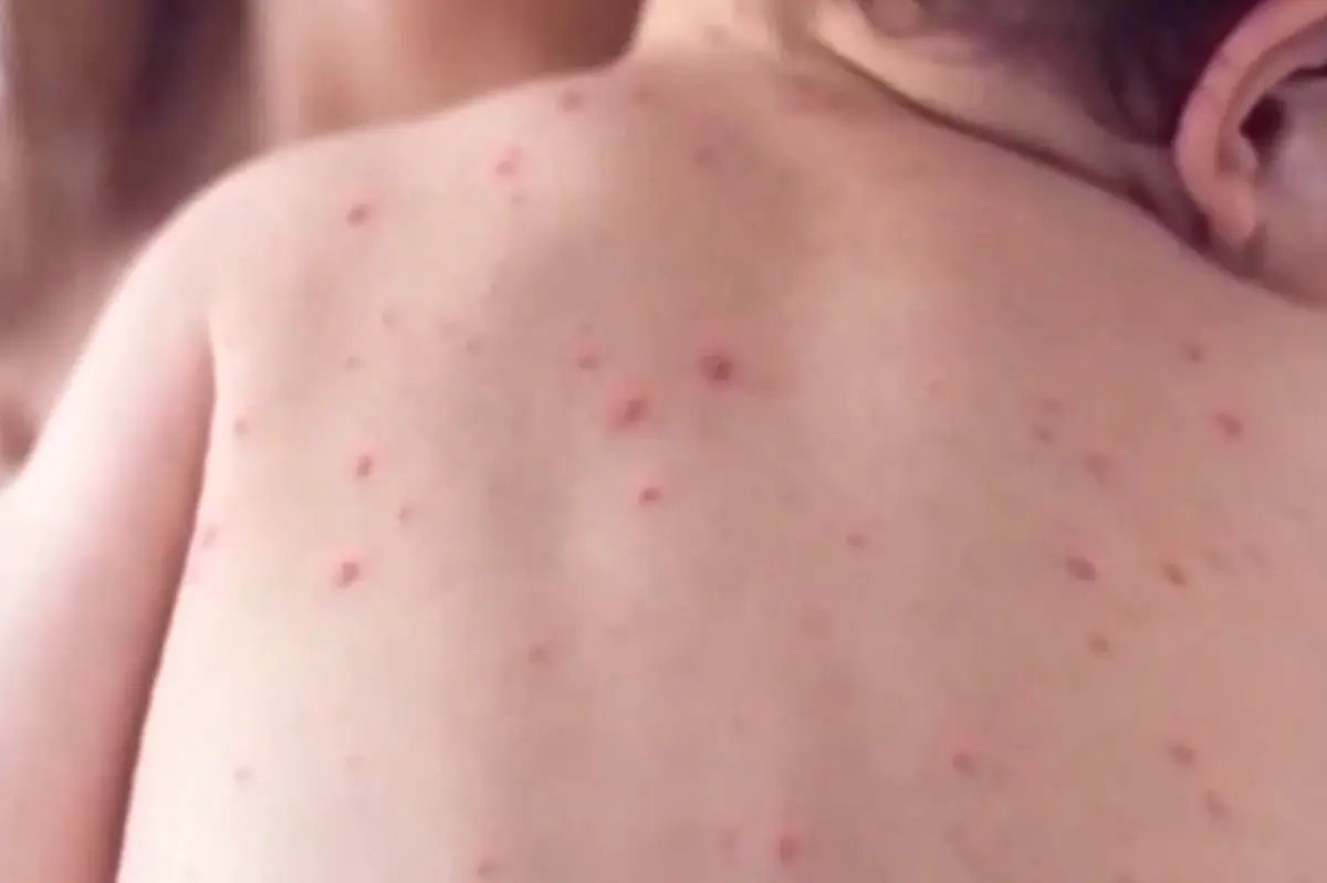 Close-up of a person's upper back and shoulder covered in a measles rash.