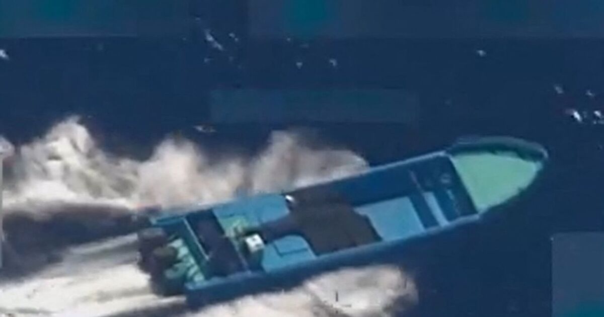 A short video clip released by Hegseth shows a small boat partially loaded with brown packages moving across the water. Moments into the footage, the boat erupts in flames and is left floating motionless and burning on the surface.