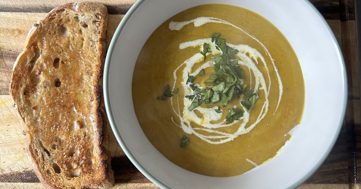 Then, ladle it into your bowl, top with a swirl of cream, some coriander or extra olive oil, dunk in some buttered bread and enjoy.