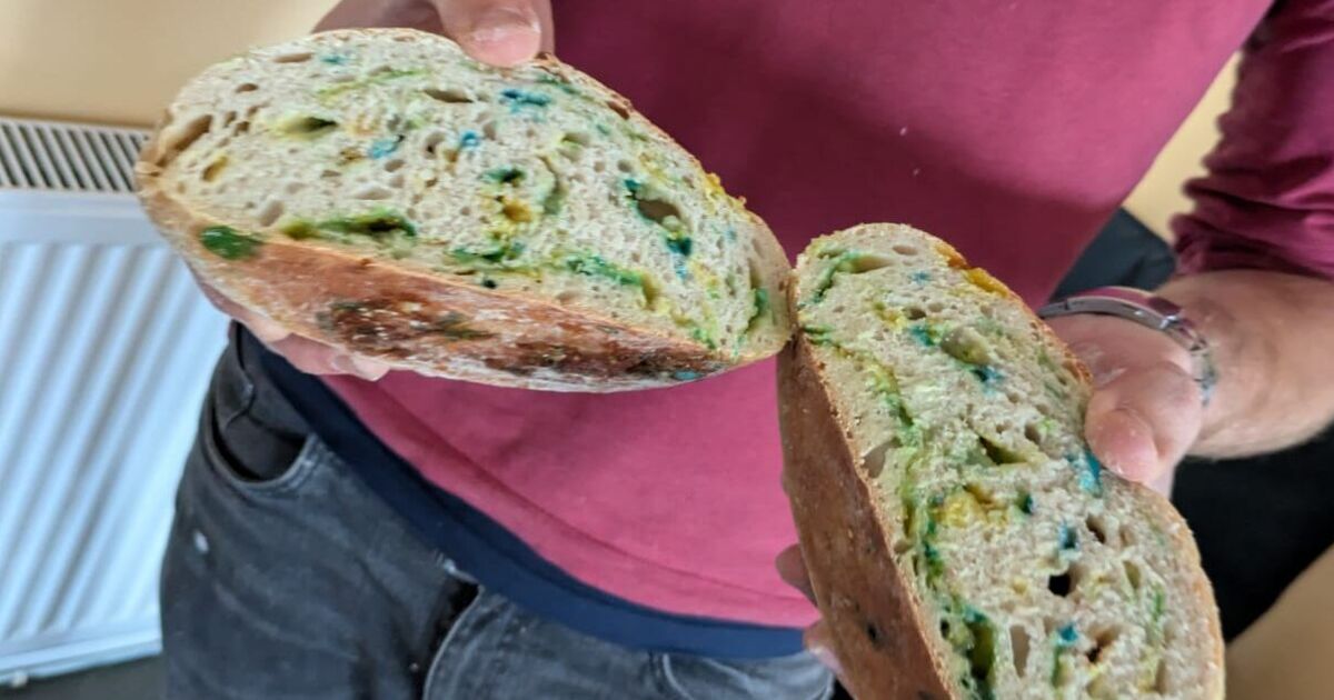 That meant it all came down to the final loaf. I said a silent prayer to the bread gods that I would not have to make a third batch but, to my delight, the loaf had a delightful and evenly-distributed swirl of greens and blues throughout. Relief washed over me.