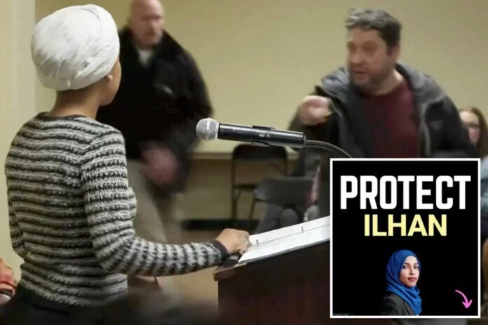 Ilhan Omar was speaking at a town hall when the unhinged man approached. REUTERS