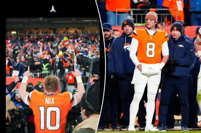 Jarrett Stidham’s wife, Kennedy, shared a folded hands emoji on Instagram after the Broncos announced that star quarterback Bo Nix will miss the remainder of the postseason with a fractured right ankle, forcing her husband — Denver’s backup — into the spotlight and starting role ahead of the AFC Championship game.