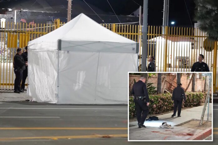 Footage from the scene showed the man’s body under a white tent near a large pool of blood.