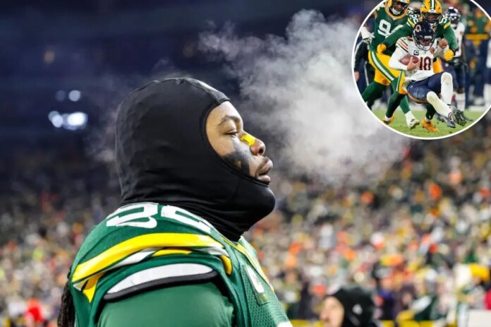 Green Bay Packers defensive end Rashan Gary exhales, with visible breath in the cold air, while wearing a black balaclava and green jersey.