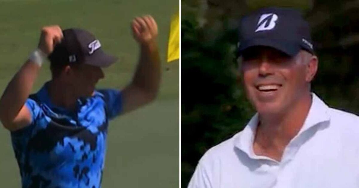 Kuchar then hit an almost identical shot to the player 14 years his junior, also landing his tee shot in a similar spot, around 12 yards from the hole, before the ball rolled up the green and into the hole.