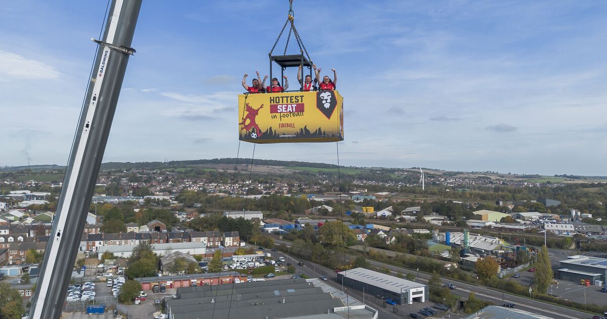Salford City supporters were lifted 50 metres into the sky by a crane to enjoy their team’s match against Chesterfield FC, pint in hand. A select group of lucky football fans were hoisted an impressive 50 metres above ground by crane to watch Saturday’s clash between Salford City FC and Chesterfield FC, all while enjoying a pint.