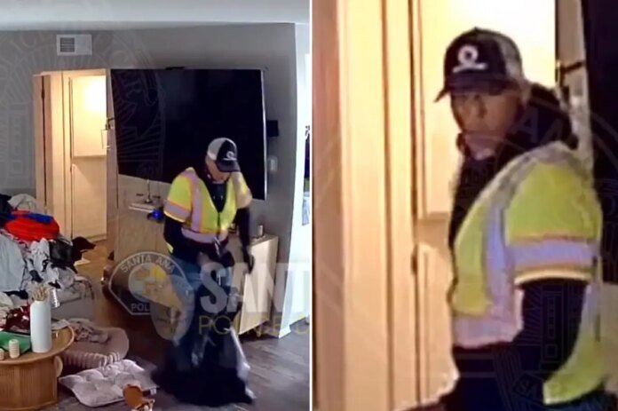 Disturbing surveillance footage captured a daytime burglar skulking around a woman’s Santa Ana apartment in a construction vest before making off with thousands of dollars in cash and designer goods.