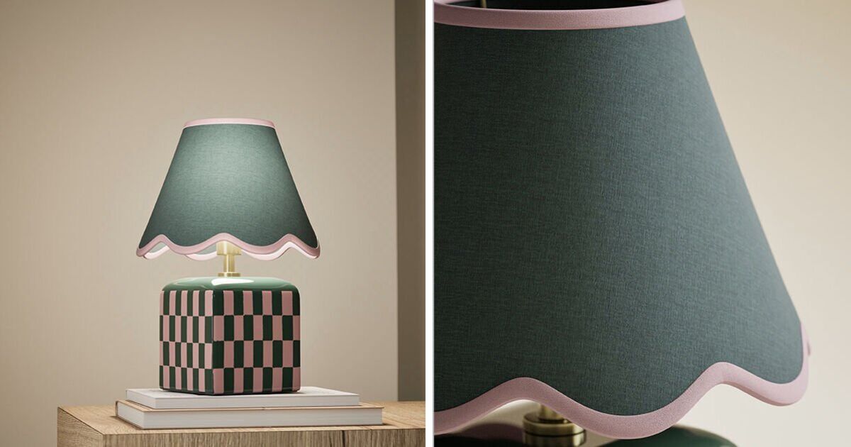The lamp costs £49.50 and comes in three variants: a pink and teal, a burnt orange, and a blue option. It has a ceramic cubic base with a checkerboard pattern, and a tapered lampshade with a scalloped trim.