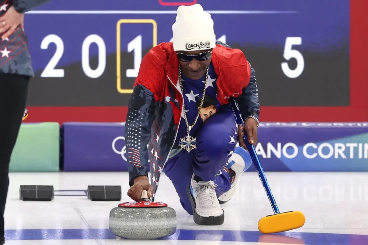 Snoop Dogg is seen using a Team United States broom on the ice. Getty Images