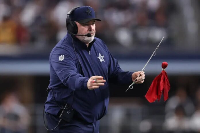 Mike McCarthy throws a challenge flag during the fourth quarter against the Washington Commanders at AT&T Stadium on January 05, 2025 in Arlington, Texas. Getty Images