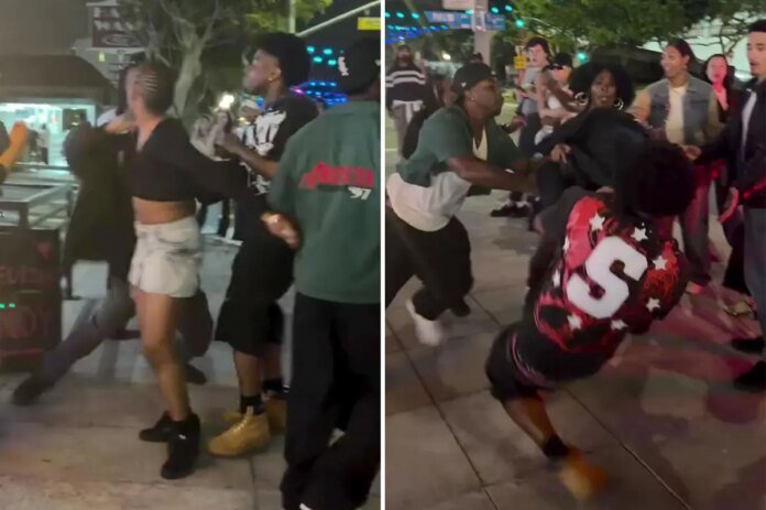 What sparked the violence remains unclear, but video shows a group of nearly a dozen people crowding in the middle of the sidewalk. Several participants can be seen throwing punches and grappling, while others try unsuccessfully to break up the fight.