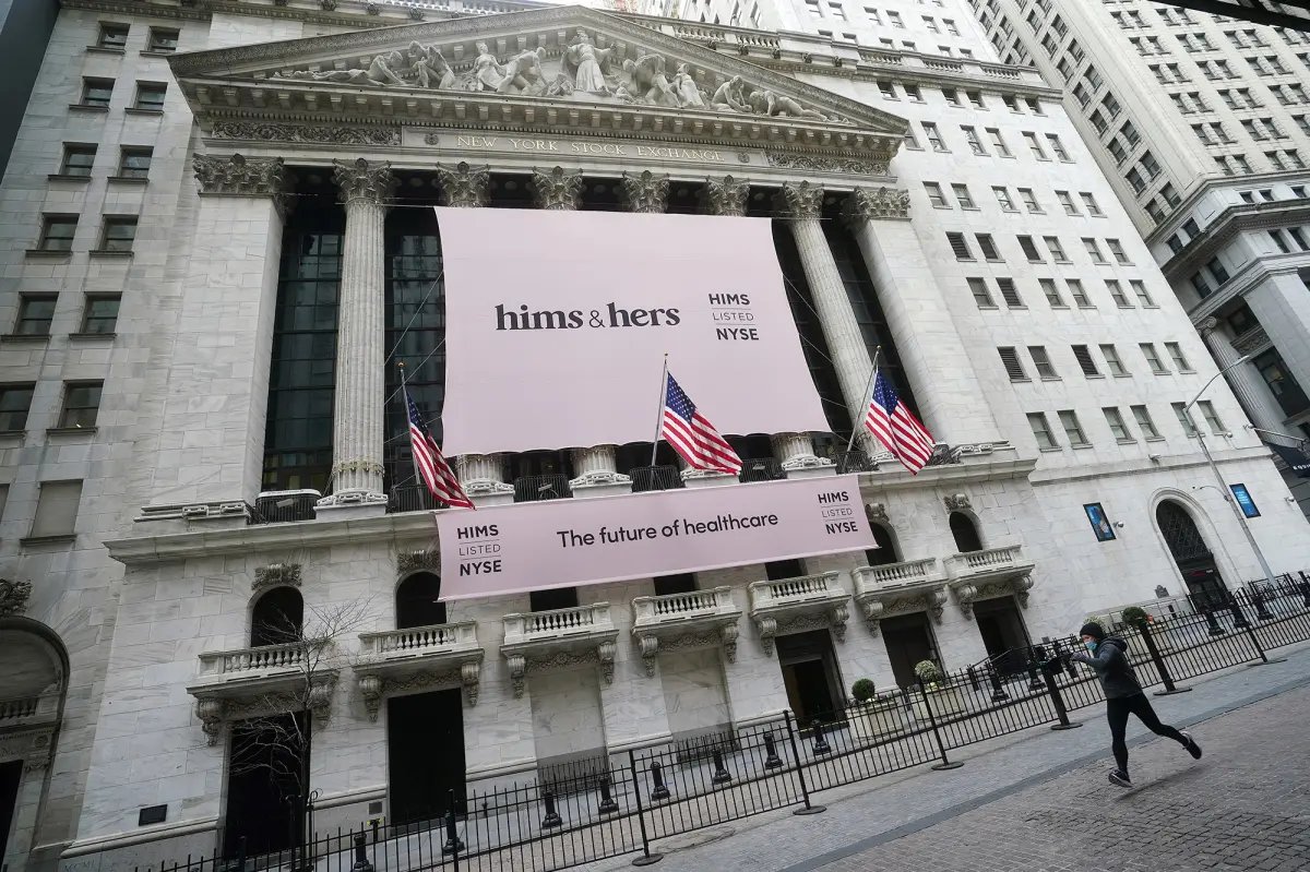 The New York Stock Exchange building with a "Hims & Hers" banner and a person running past.