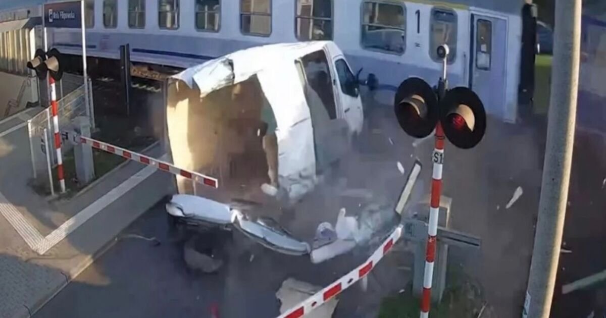 The incident took place at a guarded level crossing in Wola Filipowska, a village just outside Krakow. Footage shows an Opel delivery van trying to cross the tracks as the warning barriers began to lower. The driver, apparently attempting to beat the train, failed to clear the crossing in time and became trapped between the gates.