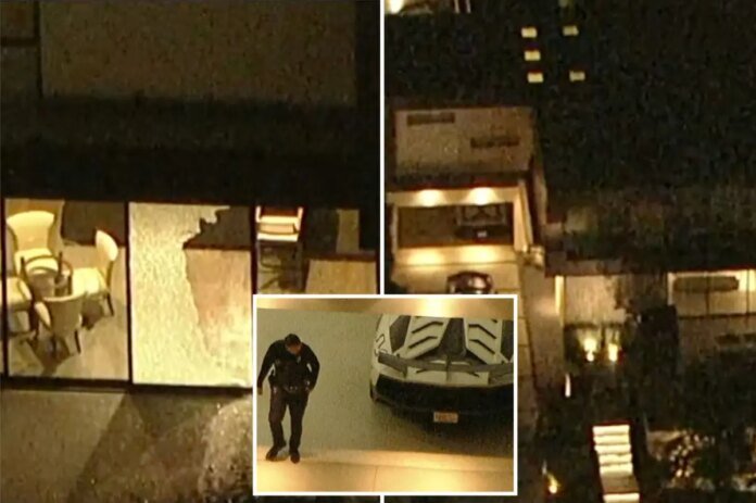 Aerial footage of the hillside mansion showed a large glass door shattered and an upstairs bedroom in disarray as officers conducted their search.