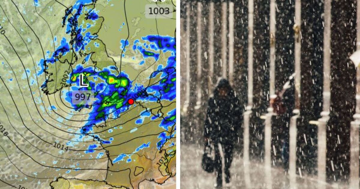 Weather charts show a tightly packed low-pressure system with central pressure as low as 993mb drawing moisture-laden air across the UK.