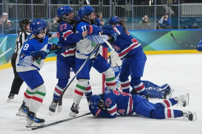Things got particularly heated late in the second period when Hannah Bilka scored Team USA’s sixth goal and fell on top of Italian netminder Gabriella Durante.