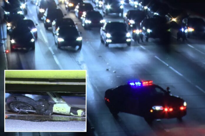 The plunging scooter forced multiple drivers to swerve and pull over, according to the California Highway Patrol. No immediate details regarding injuries were available as officials continued to investigate.
