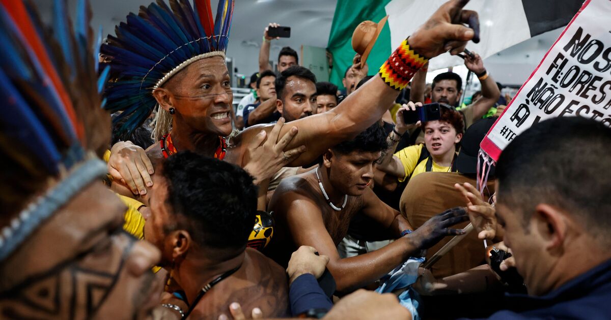 Videos circulating on social media showed protesters, seemingly from indigenous groups and others, waving flags bearing the logo of Juntos, a left-wing Brazilian youth movement.