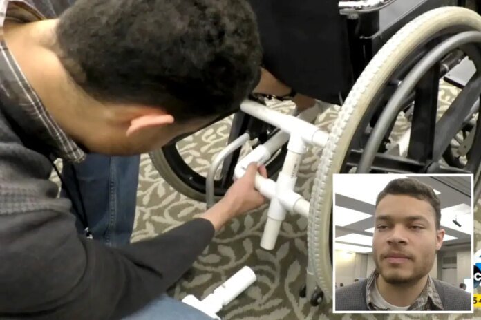 The clip, from ABC7 Los Angeles (KABC), shows a young Cole Allen — described as a Caltech student at the time — demonstrating a prototype wheelchair emergency brake at a tech conference focused on helping seniors.