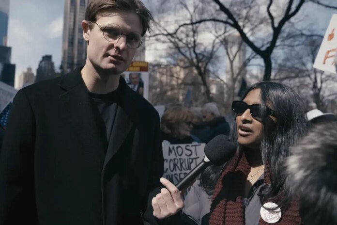A hilarious exchange during the March 28 No Kings Rally in Manhattan went viral after a woke protestor was caught on video condemning society’s treatment of the non-existent “gays of Hormuz.”